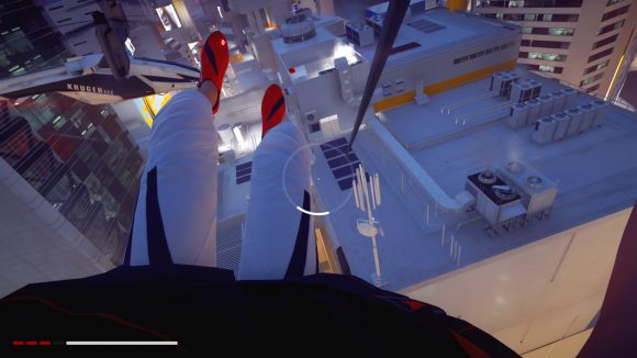 Ich mag es kaum glauben. Prophezeite ich vor einem guten Jahr noch, dass das zweite Mirror’s Edge bestimmt einiges von dem über Bord werfen werde, was den Fans gefiel, mich aber nervte, so sehe ich mich schon zu Beginn des Spiel mit genau den Problemen konfrontiert, die mich beim Vorgänger den Controller an die Wand pfeffern ließen. Ständig schmiere ich irgendwo ab und knalle auf’s Pflaster, ich habe nie das Gefühl Herr der Lage zu sein, sondern breche mir einen ab bei dem Versuch, flott durch die Stylowelt zu manövrieren. Ich bin locker zehn Mal gestorben, bevor ich das Tutorial verlassen habe. Wäre ich ein professioneller Spielejournalist (hah!) müsste ich jetzt die Zähne zusammenbeißen und durchziehen. Zum Glück bin ich jedoch Hobbyist und Knalloballoblogger (hah!), sodass ich einfach abkneifen und irgendeine Intellektuellensauce in Netz schmieren könnte. Doch die Gam0rehre lässt es nicht zu. Mit einer Blende auf die Schickimickikulisse der Stadt, gekrönt vom Mirror’s-Edge-Logo, endet das Tutorial und meine wahre Prüfung beginnt.