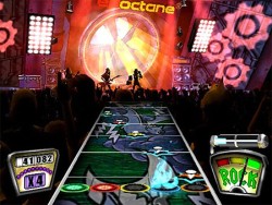 Recht verblüfft war ich, als ich irgendwann mal richtig auf die Hintergrundanimationen des Spiels geachtet habe: Da man anfangs ja mit dem Spielen völlig ausgelastet ist, geht das Treiben im Hintergrund zunächst unter. Dort kann man nämlich animierten Bands beim Auftritt zusehen. Was auf den ersten flüchtigen Blick zunächst genauso aussieht wie die relativ sinnfreien „Freqz“ aus den Vorgängern, die nur albern und uninspiriert zum Rhythmus herumhampelten, entpuppt sich bei genauerem Hinsehen als Zusatzspektakel erster Güte. Die Entwickler haben es hinbekommen, dass die Komplette Avatar-Band nahezu perfekt den laufenden Song spielt. Da passt jede Lippenbewegung des Sängers, jeder Griff der Gitarristen/Bassisten und jede Bewegung des Schlagzeugers exakt zur Musik! Und sie spielen den Song nicht nur einfach herunter. Gott bewahre. Da wird auf der virtuellen Bühne so ziemlich jedes Klischeeposing abgezogen, das die Rockmusik so hergibt: Man spielt sich gegenseitig an, läuft auf der Bühne herum, kniet bei Soli nieder, wirft die Gitarre in die Luft oder zertrümmert sie gleich auf den Monitorboxen. Gepaart mit dem sehr schön animierten Publikum in den Clubs bzw. vor den Bühnen und vielen tollen Kameraperspektiven (inklusive Tiefenunschärfe und anderer cooler Effekte) bekommt man in GUITAR HERO nebenbei virtuelle „Live-Video-Clips“ geboten, die Ihresgleichen suchen.