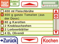 Nachdem man sich für ein Gericht aus der Datenbank entschieden hat, geht das Programm mit einem die Zutatenliste durch. Hier kann man abhaken, was man bereits im Haus hat und was nicht. So kann man den DS gleich in den Supermarkt schicken als interaktive Einkaufsliste mit in den Supermarkt nehmen. Wieder zuhause geht man nun alle Vorbereitungsschritte mit dem Programm durch, so dass beim eigentlichen Kochen keine unnötige Hektik ausbricht, weil man beispielsweise plötzlich merkt, dass die Hühnerbrühe, welche nun eigentlich hinzugegeben werden muss, noch gar nicht hergestellt wurde. Beim Kochvorgang selbst gibt das Programm ebenfalls eine sinnvolle Schritt-für-Schritt-Systematik vor und hilft mit netten Details, wie zum Beispiel einem Garzeittimer.