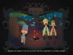 Nun, einfach ausgedrückt rennt man durch eine mit Rosenduft, zwitschernden Vöglein und Blumen in allen Pastellfarben des Regenbogens erfüllte Szene des Märchens und scheißt es in der Haut des bärtigen, buschigen, augenbrauigen, stinkenden, wie ein Seemann fluchenden Erzählers richtig zu. Zu Anfang bewirkt seine Anwesenheit etwa, daß die Blümchen ihre Köpfe hängen lassen, steigt man jedoch ein paar Levels auf, setzt man auch die Vögel in Flammen und zombiefiziert die Toten, bis man schlussendlich seine Umgebung in eine flammende Hölle verwandelt. Erreicht man ein vorgegebenes Ziel, meist genug Fläche des aktuellen Raumes eingesaut zu haben, schreitet die Geschichte etwas voran und man erlebt das Märchen im grimmschen Geist, also wie der angstfreie Junge die steifen Gehängten nicht nur bemitleidet, sondern bemitleidet, abhängt, das tote Fleisch massiert, sie mit Wolldecken ans Feuer setzt und sie Feuer fangen. Leider wiederholt sich diese Prozedur wieder und wieder, wahrscheinlich auch in allen folgenden Folgen, und am Ende wird einem dann noch einmal eine Zusammenfassung der verwandelten Szenen vorgespielt, gespickt mit einer mäßig witzigen Moral der Geschichte.