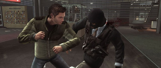 3. Kämpfe: Herzstück des Spiels sind die Kämpfe Mann gegen Mann. Dann dreht sich die Kamera in eine Beat’em’Up Position und es wird sich geprügelt bis die Knochen brechen. Hat man einige Schläge platziert, steigt das Adrenalin in Jason und er kann brutale Takedowns ausführen. Je nachdem, wo die Figuren dabei stehen, werden unterschiedliche Gegenstände in der Umgebung in diese Fatalities eingewoben. So landen Gegner kopfüber im Kopierer, Waschbecken oder bekommen die Hände mit einem Stift perforiert. Das ist alles edgy inszeniert und tut teilweise allein vom Zusehen schon weh. Zwischen den Schlägereien darf noch geschossen werden, wobei sich das Spiel in einen x-beliebigen Shooter verwandelt. Es wird in Deckung gegangen, kurz aufgesprungen, geschossen und weitergerannt. Kennt man, ist ok, muss aber nicht sein und fühlt sich teilweise etwas hakelig an. In der Mitte der Spielzeit gibt es noch eine Autoverfolgungsjagd, aber die ist schneller vorbei als ihr Quick Time Event sagen könnt.