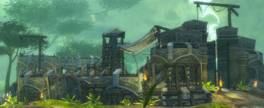 Aber ich gebe zu, nicht die große Crafting-Queen zu sein, daher liegt dieser Teil des Spiels bei mir relativ brach. Ein weiterer Teil, dem ich mich bisher noch nicht allzu ausgiebig gewidmet habe, ist die bisherige Stärke von Guild Wars: Das PvP. Bisher habe ich nur kurz in die wöchentlichen Turniere geschaut, die zwischen drei Servern ausgetragen werden und auch so lustige Kleinigkeiten wie Katapulte und Nachschubversorgung der eigenen Truppen beinhalten. Etwas länger hängen geblieben bin ich bei den schnellen 5vs5 Maps, die mir einen Wahnsinnsspaß gemacht haben. Die Maps sind schön gestaltet und gerade dieses King of the hill-Ding mag ich immer wieder gern. Dadurch, dass angefangene Spiele nicht durch Verlassen von Spielern beendet, sondern die leeren Plätze mit neuen Spielern aufgefüllt werden, sind zwar die Wartezeiten gering, allerdings kann es passieren, dass man nicht mit Spielern, mit denen man sich als Gruppe mit weniger als fünf Mitgliedern angemeldet hat, auch wirklich in eine Gruppe kommt. Aber auch nicht schlimm, eher lustig, vor allem, wenn man zusammen im TeamSpeak hockt.