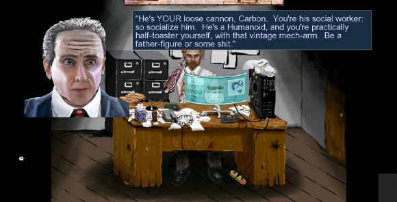 Denn wo Neofeud eigentlich glänzt, das ist beim Fokus auf die Opfer, die Betroffenen und die im System Verfangenen. Carbon, seine Schützlinge in der Syntheten-Sozialarbeit, die Mitrevolutionäre, die ihn auf den Pfad gegen das feudale Regime führen. Hier wirken auch die dem Spiel zur Verfügung stehenden Mechaniken. Denn abgesehen von seinem Ehrgeiz ist Neofeud ein sehr klassisches Point & Click-Adventure, dass sonst höchstens noch durch seinen eigenartigen, handgezeichneten Stil herausstechen könnte. Dementsprechend funktioniert die Progression im Spiel über sehr konventionelle Inventarrätsel, die sich jedoch durch Karls Leatherman-Cyberarm sehr organisch in die Welt integrieren. Damit lassen sich Slums navigieren, ohne die Involvierung zu brechen — goldene Paläste weniger. Wann immer Neofeud versucht, politisch relevant zu werden, bricht das eigensinnige Gerüst und die hakelige, altmodische P&C-Steuerung tritt eher störend in den Vordergrund, als dass sie Gewohnheit verschafft. Glücklicherweise navigiere ich Karl Carbon mehr als die Hälfte unserer gemeinsamen Zeit durch ebenjene Slums, weswegen ich meine Zeit mit Neofeud absolut nicht bereue. Ich würde mir gar ein komplettes Spiel im Stil von Coastlandias Sozialarbeitersetting wünschen. Hier hat Silver Spook über die Dialoge, die Lebensumstände der Charaktere und zu großen Teilen durch den farbenfrohen Zeichenstil sehr gute Arbeit geleistet.
