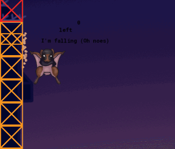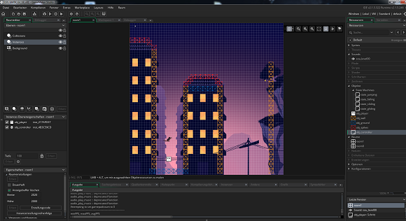 Glücklicherweise waren wir aber sehr gut in der Zeit und mussten uns trotz dieser Überraschung nicht zu sehr stressen. Das erste Level, welches nach dem Tutorial kam, musste zwar auch an einigen Stellen angepasst werden, wurde aber rechtzeitig fertig. SmashArist produzierte fleißig weitere Sprites und Animationen. Da Kmspirit und ich nicht mehr viel zu tun hatten, haben wir einen Titel- und Credit-Screen erstellt. Insgesamt hatten wir also ein fertiges, in sich abgeschlossenes Spiel. Hätten wir mehr Zeit gehabt, hätten wir noch mehr Content erstellen können. Also weitere Levels und neue Spielelemente, wie Gegner-Typen, für die sich die natürlichen Feinde von Flughörnchen geeignet hätten – also Schlangen beispielsweise (Lob an Kmspirit, die grundsätzlich zunächst über Flughörnchen recherchiert hatte). Oder Windböen, die dem Spieler Auftrieb beim Gleiten verleihen könnten. Zu meiner Schande muss ich auch gestehen, dass ich genau zwei Bugs nicht fixen konnten, die beide aber keine Game-Breaker sind: Zum einen könnte der Sprite-Wechsel von Wand-Sprung nach rechts zu links (oder umgekehrt) dafür sorgen, dass der Spieler wegen einer Verschiebung der Hitboxen in der Wand landet. Zum anderen gibt es ein Problem, wenn der Spieler auf der Plattform steht, die wir als Sicherheitsnetz im Tutorial eingebaut haben – die Lauf-Animation wird nicht abgespielt und der Spieler kann nicht von der Plattform fallen, sondern schwebt in der Luft.