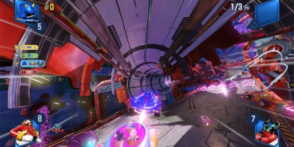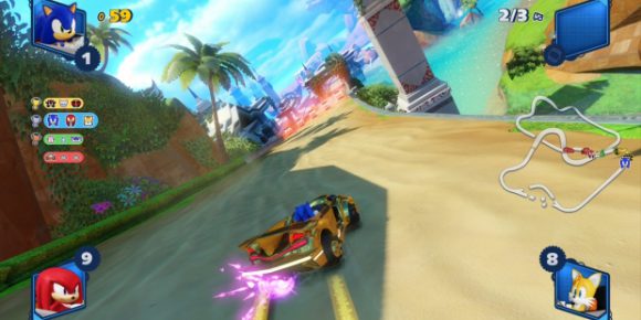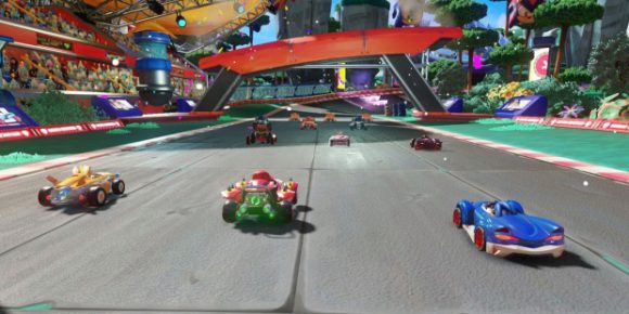 Stattdessen setzen die Entwickler den Schwerpunkt bei Team Sonic Racing auf das „Team“ im Namen: Neben dem Grand Prix Standard, bei dem jeder gegen jeden fährt, gibt es, quasi als Haupt-Modus, den Grand Prix Team. Hier fahren vier Teams aus jeweils drei Fahrern gegeneinander. Das Team ist angehalten, so gut wie möglich zusammenzuarbeiten, um zu siegen. Durch diverse Aktionen, wie das Austauschen der erhaltenen Strecken-Items untereinander, Windschatten-Turbos und dergleichen wird langsam ein mächtiger Megaturbo aufgeladen, den dann alle drei Fahrer gleichzeitig erhalten und welcher das Feld mindestens so sehr durcheinander wirbelt, wie Marios blauer Panzer oder der Kugelwilli. Das funktioniert auch alles ganz klasse und grenzt TSR spielerisch stärker gegenüber der MK-Reihe ab, als es die beiden Vorgänger taten. Speziell im Online-Modus, wenn 12 echte Fahrer in vier Teams gegeneinander antreten, bietet das Spiel ein deutlich anspruchsvolleres und kompetitiveres Gameplay als die MK-Konkurrenz.