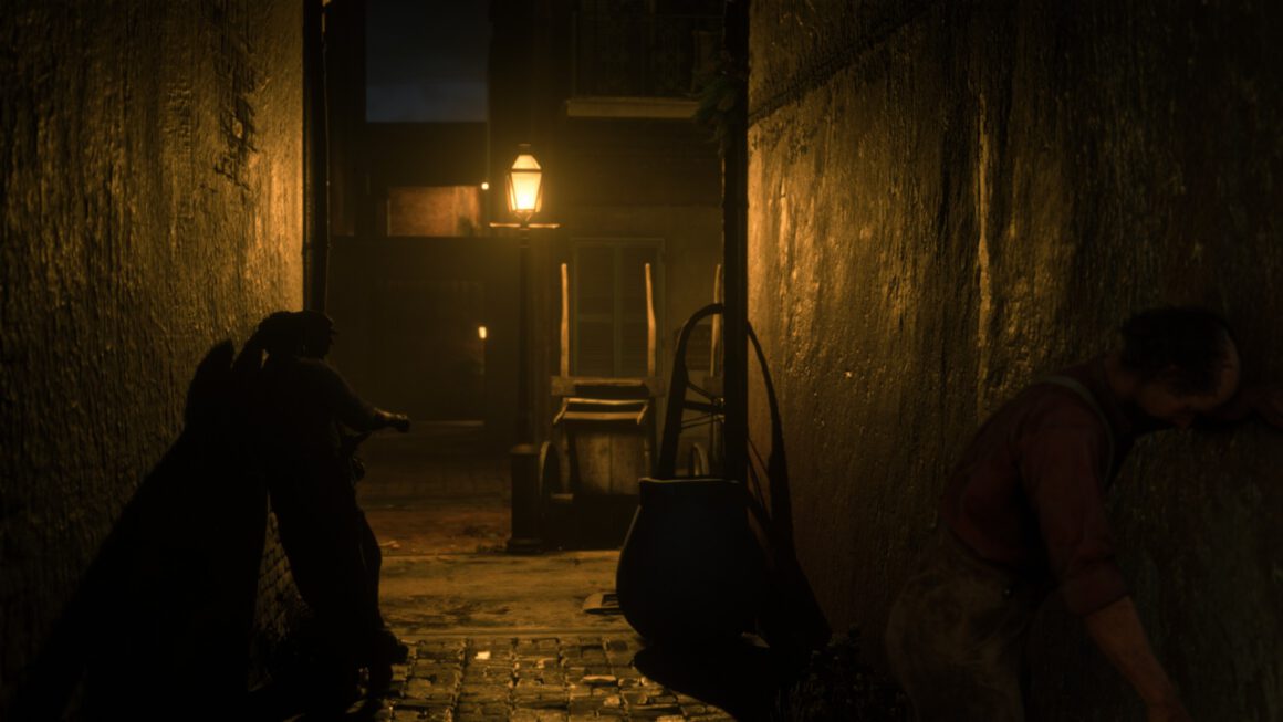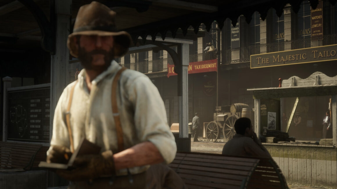 Und obwohl die Handkamera in Red Dead Online nicht fliegt oder gleitet und somit weniger Möglichkeiten bietet als der Fotomodus, entdeckt man das Spiel erst durch sie wahrhaftig und frei. Denn sobald ich im Fotomodus die Zeit anhalte, streckt der Stopp der Welt die Freiheiten der gleitenden Kamera nieder. Ich muss im Fotomodus nur bedingt auf die Charaktere reagieren, wie sie ihre Arme bewegen, ihre Zigarette zum Mund führen, den Blick abwenden, höchstens warte ich es ab, um dann eine Künstlichkeit zu erzeugen, die ein perfektes Foto ermöglichen soll – und durch den Stopp der Zeit auch wird. Mit ein wenig Tiefenschärfe hier, bisschen Kontrast da gelingen auch Anfängern tolle Bilder in kuddelmuddeliger Kulisse.