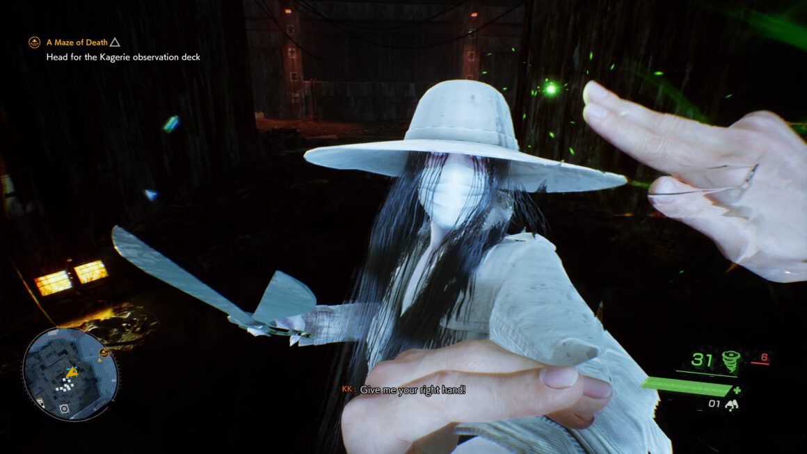 Diese 30 Stunden, in denen ich noch kaum Nebenmissionen oder andere interessante Punkte in der Welt gesehen habe, werden schließlich begleitet vom inkompatibelsten Protagonisten-Sidekick-Paar seit Jahren. Mit Akitos Charakter habe ich durchaus Spaß; ein bisschen schnell wechselt der anfangs panische Millennial zwar in den Doomslayer-Modus, aber die Vermischung typischer Horrortropes und japanischer Mythologie inklusive Studio Ghibli-Anleihen mit der ihm bekannten Spielwelt fängt das gut auf. Wirklich schlimm ist jedoch KK, dessen Stimme regelmäßig hallend durch den DualSense-Controller raunt und dessen englische Synchronisation tonal so wenig zum Inhalt des Gesagten passt, als würde er ein Piranha Bytes-Spiel vertonen. Dazu kommt, dass die Übersetzung vieler der Dialoge ins Englische so schlecht zu sein scheint, dass die beiden Figuren völlig aneinander vorbei reden. Zwischendurch habe ich die Sprachausgabe ins Japanische gestellt, damit ich das Gesprochene nicht mehr verstehe und das schlechte Writing nicht mehr so auffällt. Das hatte aber leider auch den Nachteil, dass ich während der Gefechte nicht mitlesen konnte und damit erst recht keine Charakterisierung für die beiden langweiligen Dudes für mich stattfand. Ich kann nur vermuten, dass das im Japanischen besser ist.