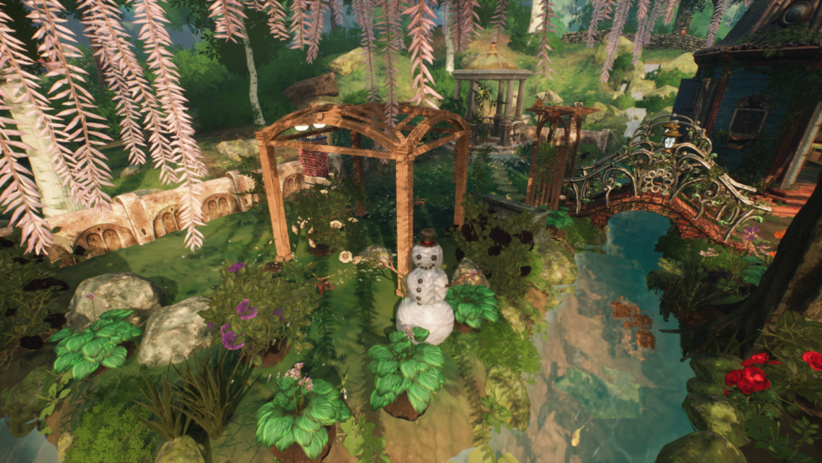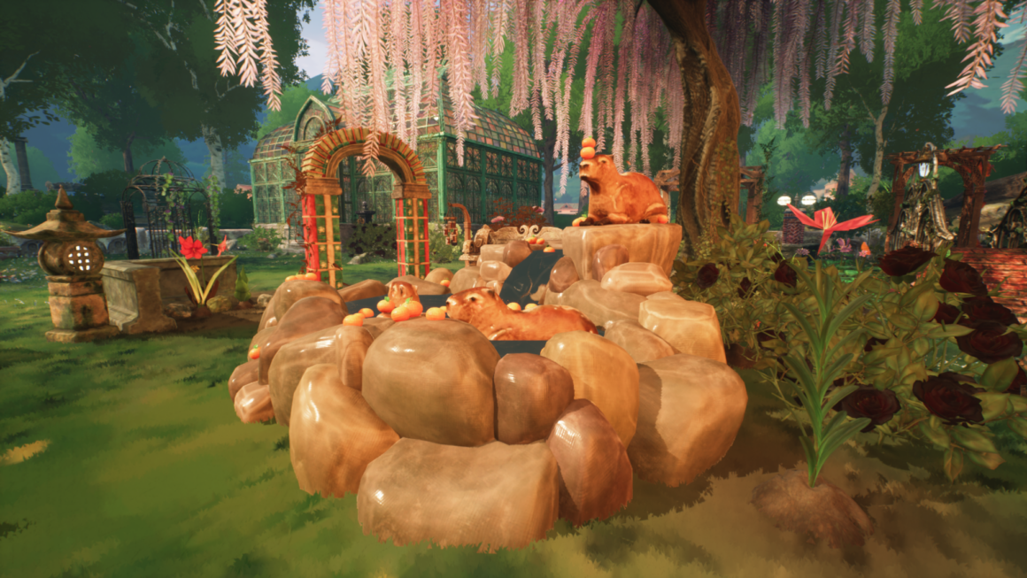 Im Lädchen kann man auch Samen kaufen, und zwar von jeder Pflanze genau eine Version in einer Farbe. Möchte man weitere bekommen, z.B. weil sie zu einer der kleinen Quests gehören, muss man sich auf sein Glück verlassen, denn andersfarbige Samen entstehen nur scheinbar zufällig an blühenden Pflanzen. Nur „scheinbar“, weil das im Normalfall schon halbwegs zeitnah zu den Aufträgen passiert. Allerdings gab es bei mir auch Fälle, in denen ich alles Menschenmögliche getan habe und trotz Pflanzen in unterschiedlichen Farben und ständiger Düngung einfach niemals die gewünschte Version rauskam. Das war besonders ärgerlich, als es darum ging, das Gewächshaus eröffnen zu können, was für mich erst am Ende des Winters – also zum Ende des Spielejahres – ging. Worauf ich auch in meinem zweiten Frühling (jaja) leider immer noch warte, ist eine rosa Rose, die für die Fertigstellung der dritten von sehr vielen Blumenskulpturen nötig ist. Die große Skulpturenausstellung im imposanten Park des Dorfes ist eine wunderbare Idee und als Aufgabe gedacht, die das Spiel auch nach allen Erweiterungen im Garten noch interessant halten soll. Dadurch, dass sie aber in einer bestimmten Reihenfolge zusammengestellt werden müssen und gleichzeitig aber speziell dafür benötigte Blumen fehlen, ist dieser Spielteil für mich blockiert. Da kann ich nur hoffen, dass der Punkt möglichst bald gefixt wird, damit ich endlich meine kargen Skulptur-Skelette aufhübschen kann!
