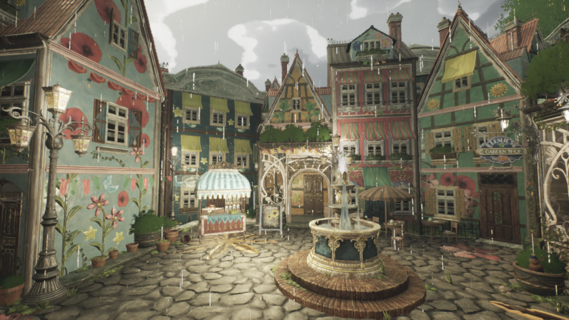 Aber gehen wir erst mal zurück zum Anfang, eigentlich ist es nämlich sehr tragisch: Bisher hat sich Robin um den mehr oder weniger Gemeinschaftsgarten gekümmert, ist vor einer Weile aber gestorben. They wird von allen sehr vermisst, aber trotzdem sind alle guter Dinge, dass wir den Aufgaben gewachsen sind. Diese bestehen einerseits daraus, den Garten nach seiner Alone-Time wieder hübsch zu bekommen und ihn nach und nach mit kostspieligen Upgrades zu erweitern und andererseits in Vorbereitung darauf, verschiedene kleinere und größere Aufträge zu erledigen, die einem das Sparschwein füllen sollen. Sie erstrecken sich von „Ich brauche einen Strauß rote Rosen für einen Geburtstag“ bis hin zu „Pflanze 30 Exemplare der folgenden Pflanze in deinen Garten“. Letzteres kann schon mal ein wenig anstrengend werden, da im Spiel aus Performancegründen die Anzahl der Pflanzen beschränkt wird. Hat man also diese Großaufträge, muss man sich wohl oder übel von seiner bisherigen Gartenplanung trennen, denn bei zu vielen Hortensien im Wind raucht einem laut Antworten der Entwickler auf einige Beschwerden möglicherweise die Konsole ab. Was mich zunächst etwas – nunja… verwundert hat – entpuppte sich dann doch als Möglichkeit, mehr mit meinem Gärtchen anzufangen, als einfach nur Pflanzen halbwegs hübsch zusammen zu setzen. Die Grundausstattung fürs Gärtnern bekommt man in einem süßen kleinen Gartenlädchen im idyllischen Ortskern, d.h. einige nützliche Werkzeuge und auch einiges an Dekoration. Ob Froschfiguren mit Zauberhut, Sitzbänke, Terrakotta-Töpfe oder auch Steinplatten für naturbelassene Gehwege, plötzlich gabs im Gemeinschafts-Paradies wieder so einiges zu tun und zu verschönern.