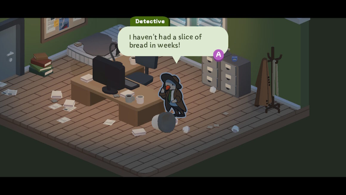 Während man sich durch alle Büroräume wütet – ja, das Umschmeißen aller Papierkörbe ist absolute Pflicht! – sammelt man aus Beobachtungen und Gesprächen verschiedene Hinweiswörter, die man ähnlich wie beim sehr beliebten The Case of the Golden Idol in immer aufwändigere Lückentexte einfügt, um alle Vorkommnisse in die Notizbuchstruktur des Ermittlers zu ordnen und die Verbrechen aufzuklären. Ganz so kompliziert wie dort wird es für den Duck Detective aber nicht, es soll ja bei allen Puzzlen auch irgendwie noch cute und zugänglich bleiben. Die zwei Stunden Spielzeit helfen dabei, aber ein bisschen Zugänglichkeit geht leider dadurch verloren, dass bisher sowohl Sprache als auch Text nur auf Englisch verfügbar sind. Aber mit ein bisschen Glück (und Erfolg) ändert sich das hoffentlich bald, damit es noch mehr und vor allem jüngere Menschen spielen können.