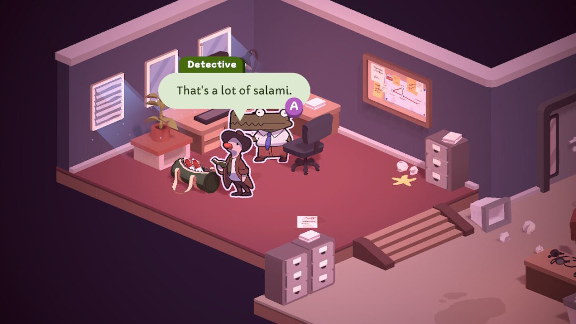 Wir landen bei Duck Detective: The Secret Salami in einem klassischen Noir-Szenario, nur ist.. nunja.. der Detektiv eben eine sehr süße Ente in Sticker-Optik, die man durch die Spielwelt steuert, als würde man mit einer dieser auf einen Plastikfuß gesteckten Papp-Spielfiguren über ein Spielbrett wackeln – was umso auffälliger ist, da das Spiel am gleichen Tag rauskam, wie Nintendos neuer Paper-Mario-Teil Die Legende vom Äonentor. Ein bisschen denkt man beim Spiel schon allein des Namens wegen vielleicht zuerst an den großartigen Frog Detective, der aber mit deutlich mehr Dad Jokes als Noir-Atmosphäre aufwartet. Film Noir ist eine ernste Sache! Duck Noir aber zum Glück eher weniger. So amüsiert man sich im Spiel über einen Ausschnitt aus einem sexy Alien-Roman, den ein Mitarbeiter geschrieben hat, genauso wie über Ladescreen-Perlen wie “Did you know? Ducks migrate thousands of miles in the winter to escape your whining”. Man soll ja auch nicht gerade ein tragisches Kapitalverbrechen aufklären, sondern einen… Tassendiebstahl? Zumindest ist das das erste Problem, auf das wir stoßen, als wir bei BearBus auftauchen. Leider hat sich der Superdetektiv am Telefon weder den Namen des Anrufenden geben lassen noch den Grund für den Anruf. Also fährt er auf gut Glück zu dem Busunternehmen und fragt sich erstmal durch, was er dort eigentlich soll. Mysteriöserweise will ihn aber niemand dort engagiert haben, weswegen er noch gründlicher recherchiert und neben den kleinen und großen Bürostreitigkeiten noch handfeste Verbrechen aufklärt.