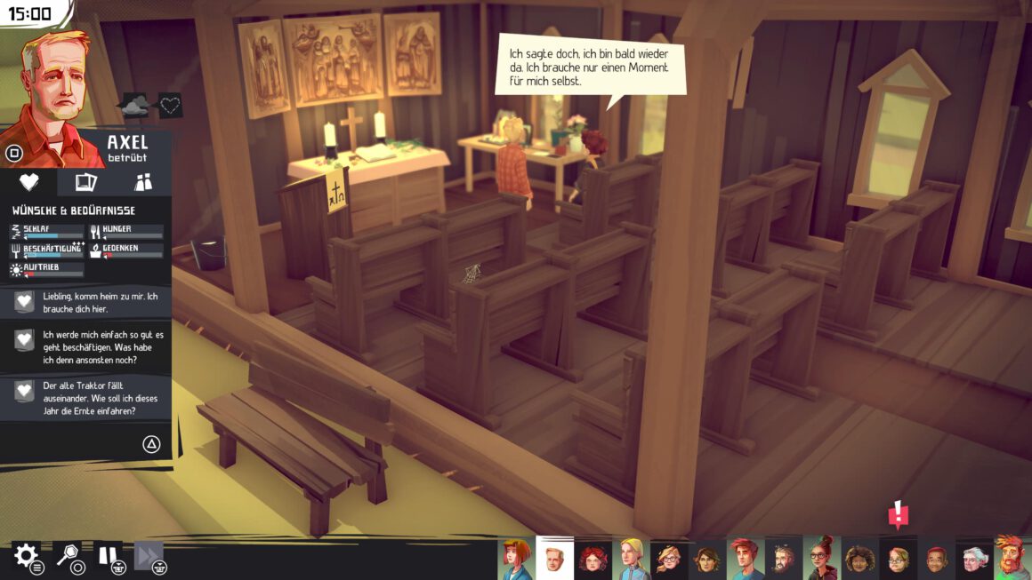 Das ist auch genau der Grund, warum das Spiel vermutlich auch beim zweiten Durchgang interessant bleibt, denn man lernt die Figuren, ihre Emotionen und Hintergründe so gut kennen, dass man den meisten von ihnen auch wirklich helfen will, glücklich zu werden und den Zusammenhalt der Gemeinschaft zu stärken. Das ist mir bei meinem ersten Versuch zwar nicht ganz schlecht gelungen, aber nicht wirklich so, wie ich mir das vorgestellt hatte. Das lag unter anderem an einer Sache (einem kleinen Bug vor Release, der sicher schon gefixt ist, wenn ihr das spielt), und zwar wurden Handlungen, für die eine der Figuren gerade nicht verfügbar war, ausgegraut und nicht mehr angeboten. Leider ist mir das bei zwei meiner Herzensangelegenheiten passiert, was mich dann doch etwas traurig gemacht hat. Aber da es dann sehr passend zum Thema des Spiels war, hat es wohl auch irgendwie nur zur Gesamtstimmung beigetragen.