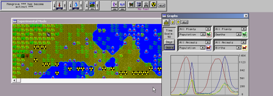 Wie es sich für ein ordentliches Labor gehört, bietet einem SimLife die Möglichkeit, die der Welt zugrunde liegenden Daten zu visualisieren. Ein Arsenal von Graphen, Torten- und Balken-Diagrammen, das PowerPoint neidisch machen würde, ermöglicht einem, Bio-Diversität, Populationsentwicklung, Veränderungen in der Nahrungskette oder die Verteilung von Geschlecht, Phänotyp und so weiter zu beobachten, daneben wird einem auch noch eine Art Highscore für die Artenvielfalt in seinem kleinen Sandkasten zugewiesen. Lotka und Volterra wären sicherlich stolz auf Will Wright, Ken Karakotsios und ihr Werk, denn mit dem Spiel kann man wunderbar ihre Überlegungen zu Populationsdynamiken und wahrscheinlich auch noch einige andere wissenschaftliche Theorien nachvollziehen, doch mindestens genau so attraktiv ist es, einfach eine Karte zu kreieren, ein paar Pflanzen und Tiere auszusetzen und die Natur, soweit dies in einer grauen, stromfressenden Kiste möglich ist, das Beste daraus machen zu lassen, zuzusehen, wie sich ein paar Pixel-Haufen vermehren, gegenseitig auffressen oder verdursten, wie neue Arten entstehen und wieder vergehen, ökologische Nischen geschaffen und besetzt werden, einfach seiner Experimentierfreude freien Lauf zu lassen.