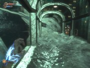 Aber dies ist noch der unwesentlichste der Unterschiede. Etwas schwerwiegender ist da schon die Tatsache, dass BioShock eigentlich vom Gameplay her nur relativ wenig Ähnlichkeit mit den Spielen hat, die es angeblich beerben sollte. Die RPG-Elemente halten sich deutlich in Grenzen und die Wahlmöglichkeiten in Bezug auf Problemlösungen und Spielverlauf sind eher Spielerei denn wirkliche Alternativen. Das gesamte Game ist sehr linear. Obwohl man sich vermeintlich frei in vielen Abschnitten Raptures bewegen kann, weist der Missionspfeil am oberen Bildschirmrand gnadenlos den Weg. Natürlich war beispielsweise Deus Ex aus narrativen Gründen auch nicht wirklich frei im Spielverlauf, aber zumindest innerhalb der einzelnen Spielabschnitte hatte der Spieler schon sehr oft die Wahl, wie er vorgehen wollte. In BioShock kommt das Gefühl, sich in einer virtuellen Umgebung frei bewegen zu können, eigentlich so gut wie nie auf. Man wird geführt. Und das sogar in doppelter Hinsicht…
